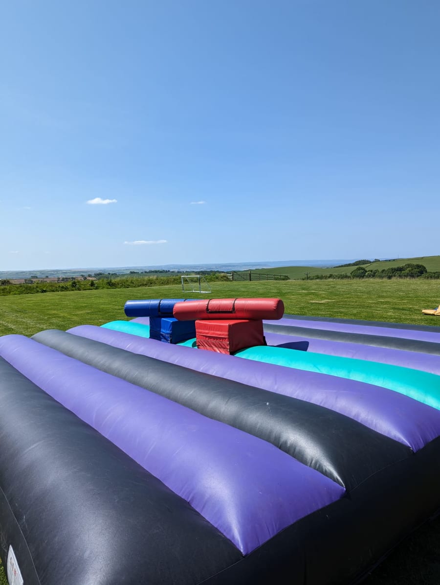 Take on your opponent and knock them off of their platform with this bouncy gladiator duel. Comes with protective head gear, neck braces and pugil sticks. Knockout fun for all ages.