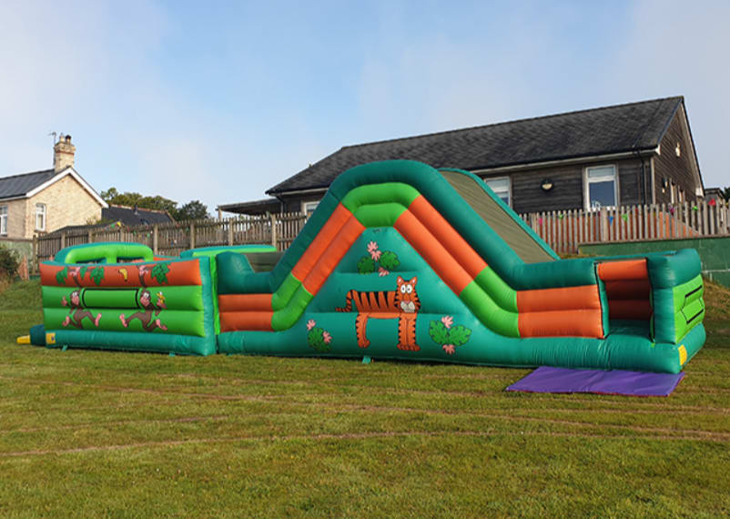 With a striking jungle theme, our two-part obstacle course measures 42ft long by 9ft wide and is packed full of fun. Climb over the fallen log and avoid being caught by the jungle animals in the biff and bash, before tackling the tunnels and the up and over slide.